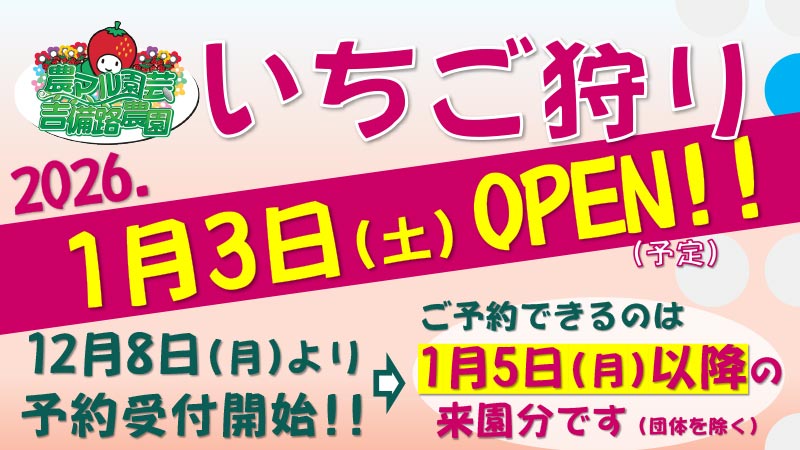 | 受付時間 | 9:00~12:00(但し、熟した実が無くなり次第終了) ※総合受付にて受付後、速やかにいちごハウスへ移動してください |