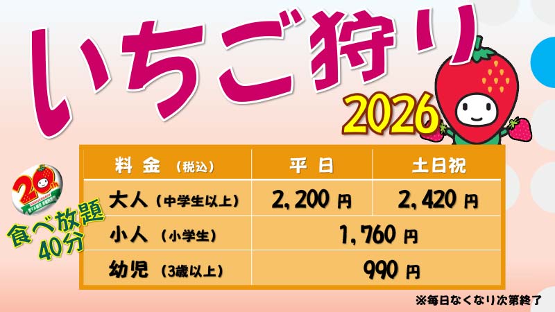 | 内容 | 40分食べ放題(持ち出し不可) ※練乳持ち込み不可(販売もありません) ※持ち帰り用の量り売りあり(料金別途)(※状況により受付のない日もあります) |